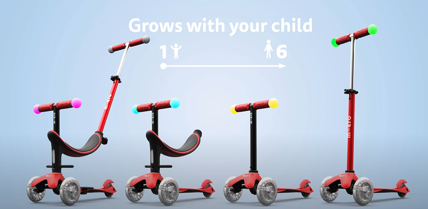 La Mini2Grow LED Magique commence comme une trottinette porteur pour tout-petits, puis se transforme en trottinette Mini LED 3 roues lorsque votre enfant devient un "grand".